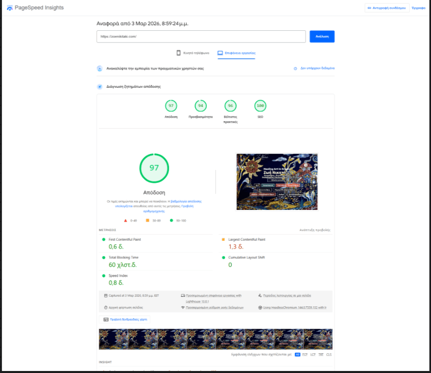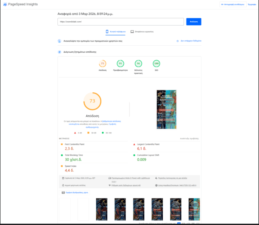 Παρά την ένταση του οπτικού ύφους, η τεχνική υλοποίηση εξασφαλίζει κορυφαίες επιδόσεις, ξεπερνώντας τις απαιτήσεις των Core Web Vitals.